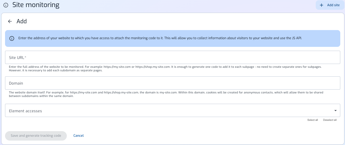 After adding a website, you can download its tracking code. This code should be placed in your website’s source code — either in the <head> or <body> section.