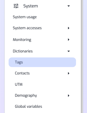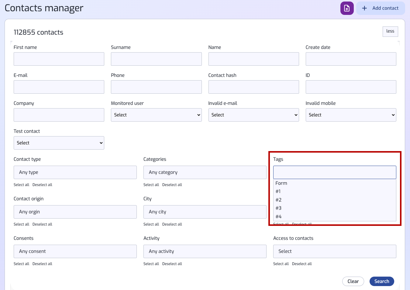 You can add a tag in many different places in the system. It may be assigned to a contact, for example, during the creation of a marketing scenario, through contact edition, or by performing a relevant action on a segment.