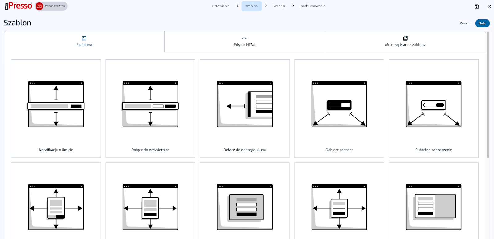 Szablony to gotowe podpowiedzi kształtu i formy Pop-upu.