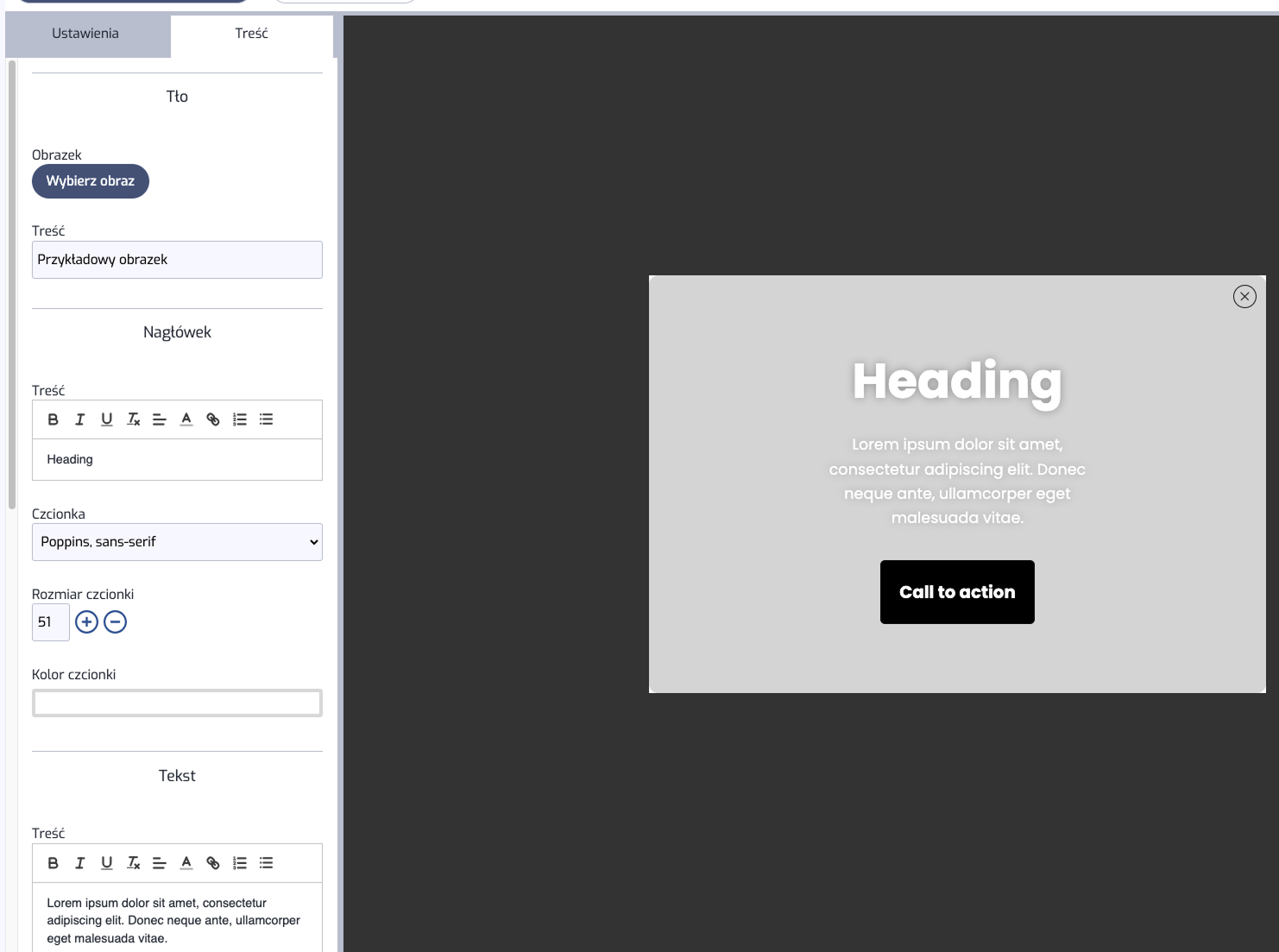 Ta opcja nie tylko umożliwia dodanie Twojej własnej grafiki w tle, ale również zastosowania go zamiast przycisku zamykającego “X”. Po wybraniu interesujących Cię obrazków, możesz je dowolnie edytować w panelu po lewej stronie, który prezentujemy poniżej.