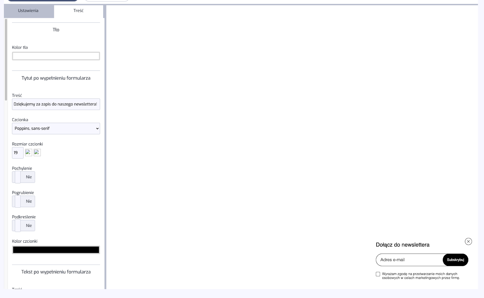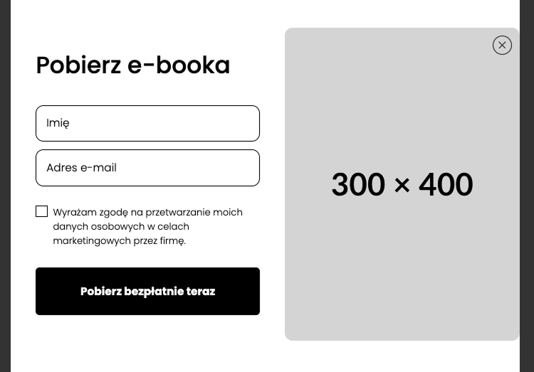 W szablonie Odbierz darmowy materiał (formularz z opisem) możesz stworzyć Pop-up z formularzem i obrazkiem. W zakładce “treść” możesz edytować treści zgodnie ze swoimi potrzebami i preferencjami. Masz możliwość wybrać obrazek zamknięcia popupu zamiast klasycznego “X”, obrazek, który ma się znaleźć koło formularza, wpisać tytuł oraz opis, edytować tekst, który wyświetli się na thank you page po wypełnieniu formularza, edytować treść i wygląd przycisku zapisu oraz treść i kolor czcionki zgody.