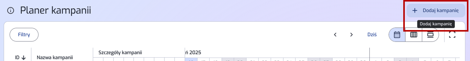 Aby dodać nową kampanię kliknij przycisk dodawania "+" w prawym górnym rogu.