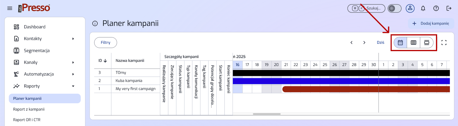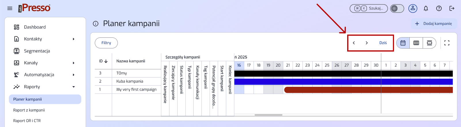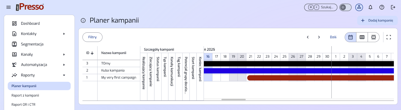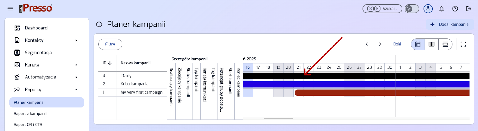 - widok dnia: Przedstawia obraz miesiąca, wyświetlając wszystkie dni poszczególnych miesięcy. W tym widoku można szerzej zobaczyć zaplanowane kampanie na każdy dzień miesiąca.