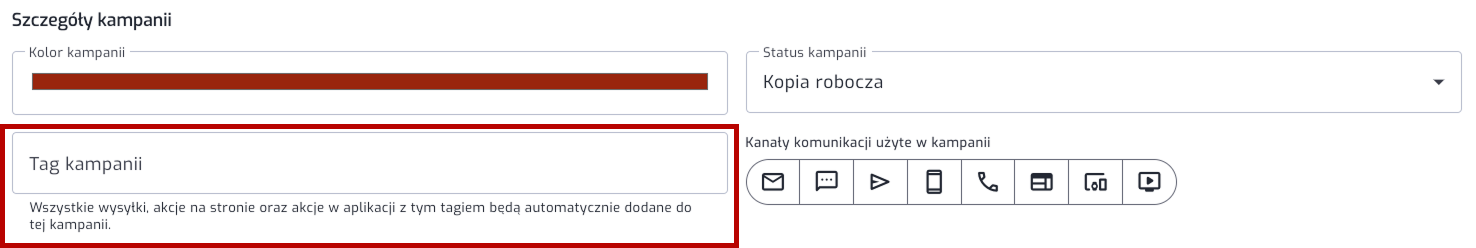 - Tag kampanii - tag, który dodawany jest do każdego kanału komunikacji, w ramach którego ma zostać dodany do tworzonej kampanii.