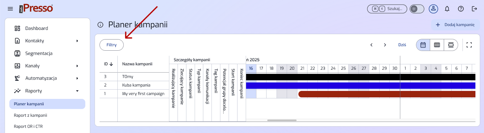 Funkcjonalność filtrowania umożliwia precyzyjne dostosowanie widoku, poprzez wyświetlanie konkretnych kampanii, które interesują użytkownika np. po wskazaniu konkretnej nazwy, bądź osoby odpowiedzialnej za realizację kampanii.