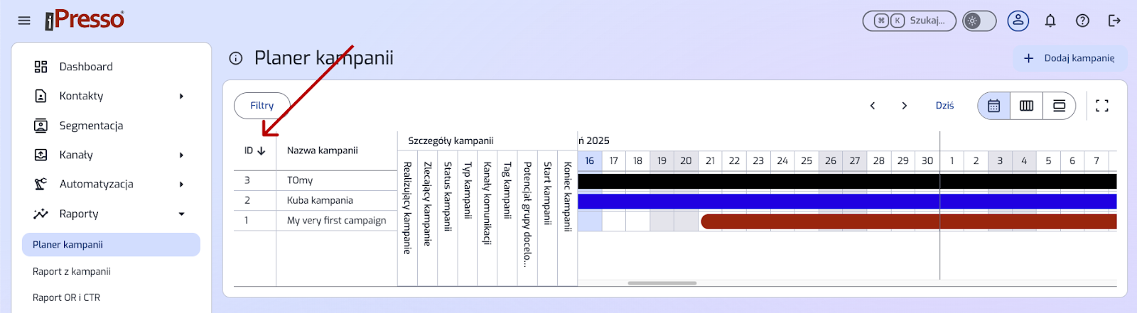 Planer kampanii znajduje się w panelu raporty w bocznej nawigacji. Aby go zlokalizować należy kliknąć na Raporty -> Planer Kampanii.