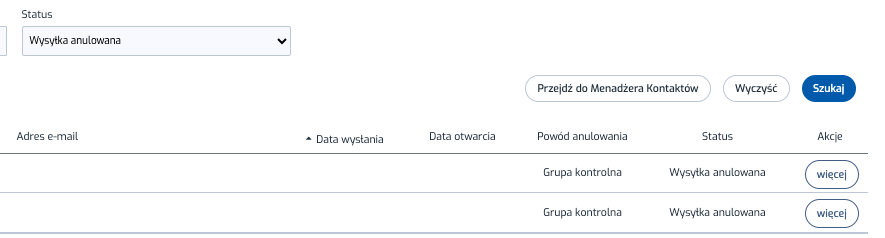Obecnie wysyłki do grupy kontrolnej są na ten moment traktowane jako anulowane. Aby zobaczyć, jakie kontakty znalazły się w grupie kontrolnej: