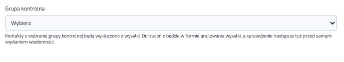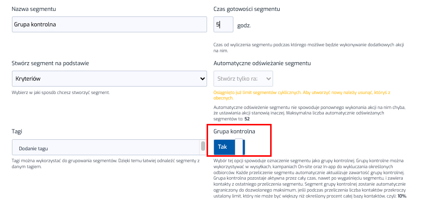 Uwaga: łączna suma kontaktów we wszystkich aktywnych grupach kontrolnych w bazie nie może przekraczać 30% wszystkich kontaktów. W jednym segmencie nie może przekraczać 10% całej bazy.