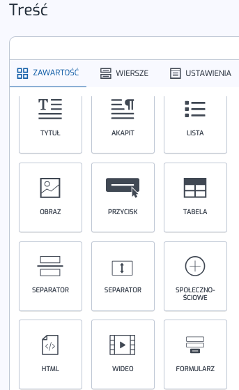 Jeśli często używasz tych samych sekcji (np. stopki, zapisu na newsletter,), możesz zapisać je jako wiersze. W zakładce Wiersze możesz tworzyć, kategoryzować i ponownie wykorzystywać własne wiersze treści.