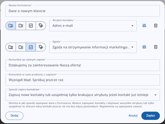 - wskazać, czy dane mają tworzyć nowe kontakty, czy aktualizować istniejące.