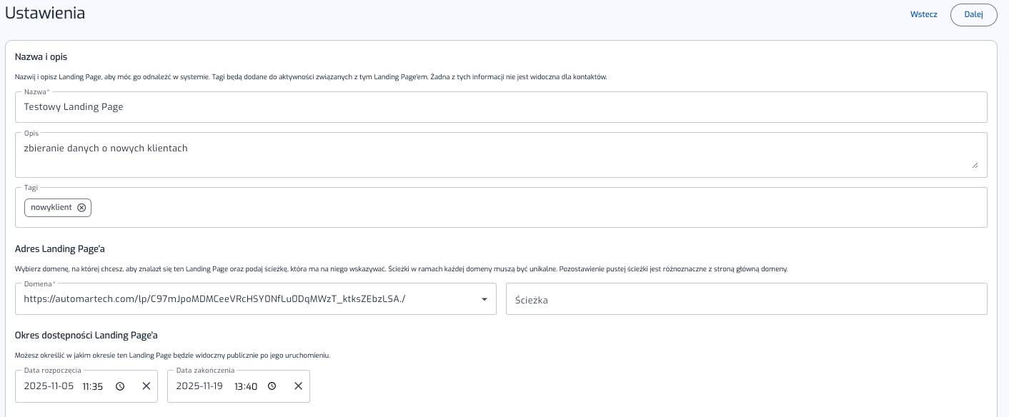 - nadaj unikalną nazwę Landing Page’a,