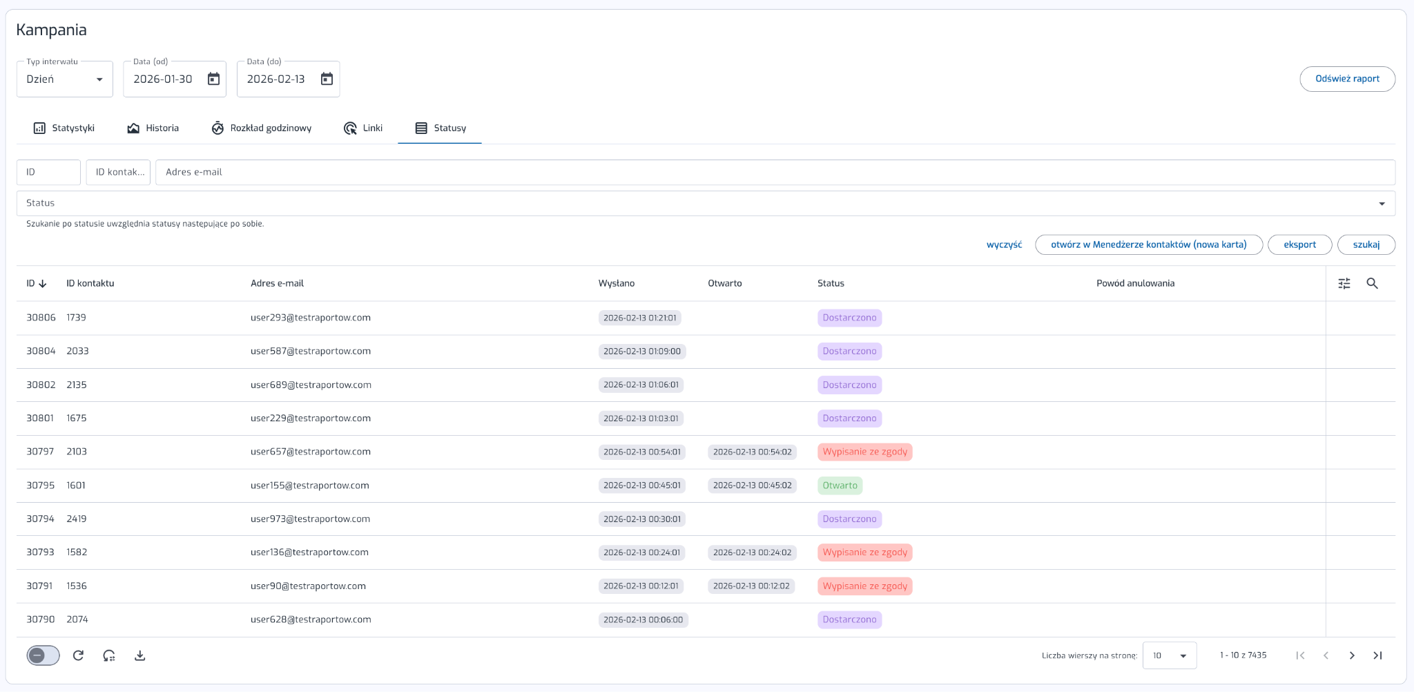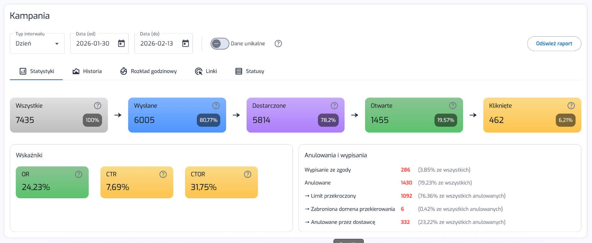 Anulowanych: Całkowitej liczbie wysyłek, które nie doszły do skutku. System szczegółowo wyodrębnia tu również przyczynę takiego stanu rzeczy (np. Anulowane przez dostawcę), co jest kluczowe dla dbania o higienę bazy i monitorowania reputacji wysyłkowej.