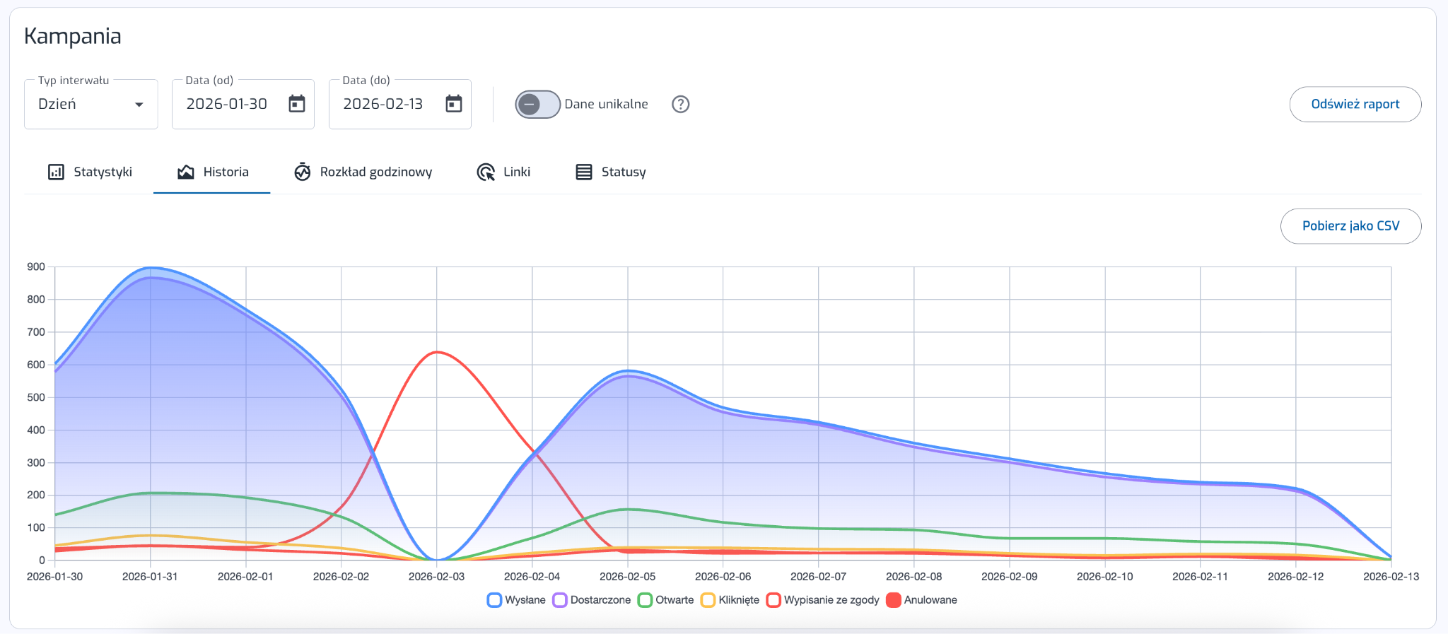 Sekcja raportu Historia prezentuje wizualizację trendów i rozkładu aktywności w czasie dla analizowanej wysyłki w ramach scenariusza. Dane przedstawione są w postaci wykresu obszarowo-liniowego, który pozwala na ocenę dynamiki zachowań odbiorców na przestrzeni wybranego okresu. Taki układ ułatwia zidentyfikowanie momentów największego zaangażowania (tzw. pików) oraz obserwację, jak szybko wygasza się zainteresowanie komunikacją po jej uruchomieniu.