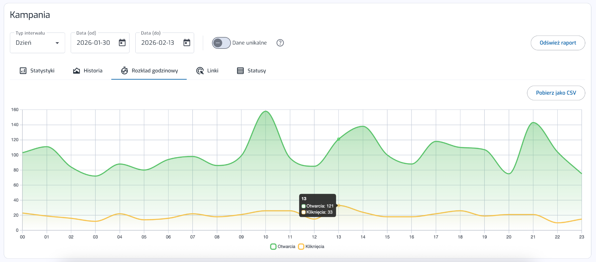 - Otwartych: Rozkładzie w czasie unikalnych otwarć wiadomości przez odbiorców. Pozwala to ocenić, jak długo "żyje" nasza wiadomość w skrzynkach odbiorców.