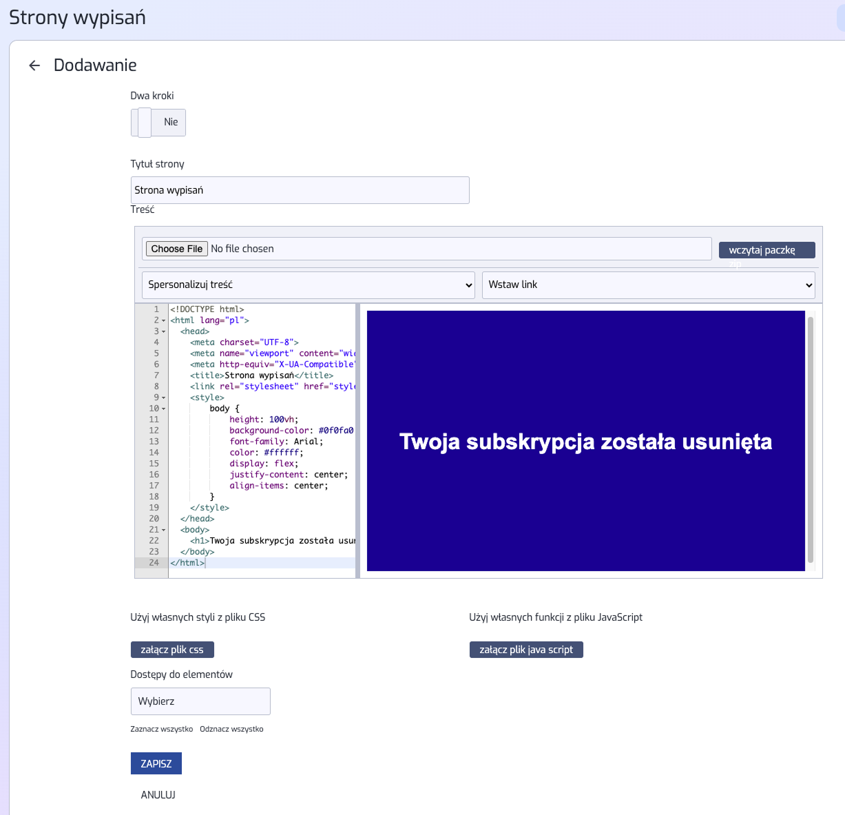 Stronę stworzysz korzystając z edytora HTML. Możesz wgrać przygotowaną wcześniej stronę poprzez wczytanie paczki zip oraz załączyć pliki ze stylami CSS i funkcjami JavaScript.