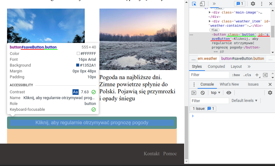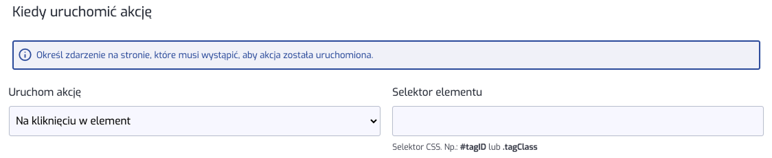 Wybierz rodzaj akcji oraz id lub klasę selektora. Poniżej przykład, gdzie po lewej stronie widać przycisk, a po prawej zaznaczone jest ID selektora: