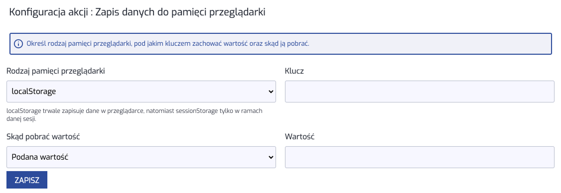 - zapis danych do pamięci przeglądarki: w ten sposób można utrzymać w pamięci przeglądarki dane. Może to służyć np. łączeniu różnych reguł Data Collectora (jest możliwe również pobranie danych z pamięci przeglądarki: patrz akapit Akcja do uruchomienia)
