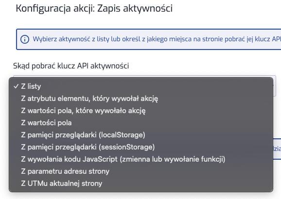 Wybierz opcję "Z listy". Pojawi się lista zapisanych w iPresso aktywności. Jeśli dla aktywności są zdefiniowane parametry, z rozwijanej listy możesz wybrać wartości parametru, który chcesz zapisać w aktywności: