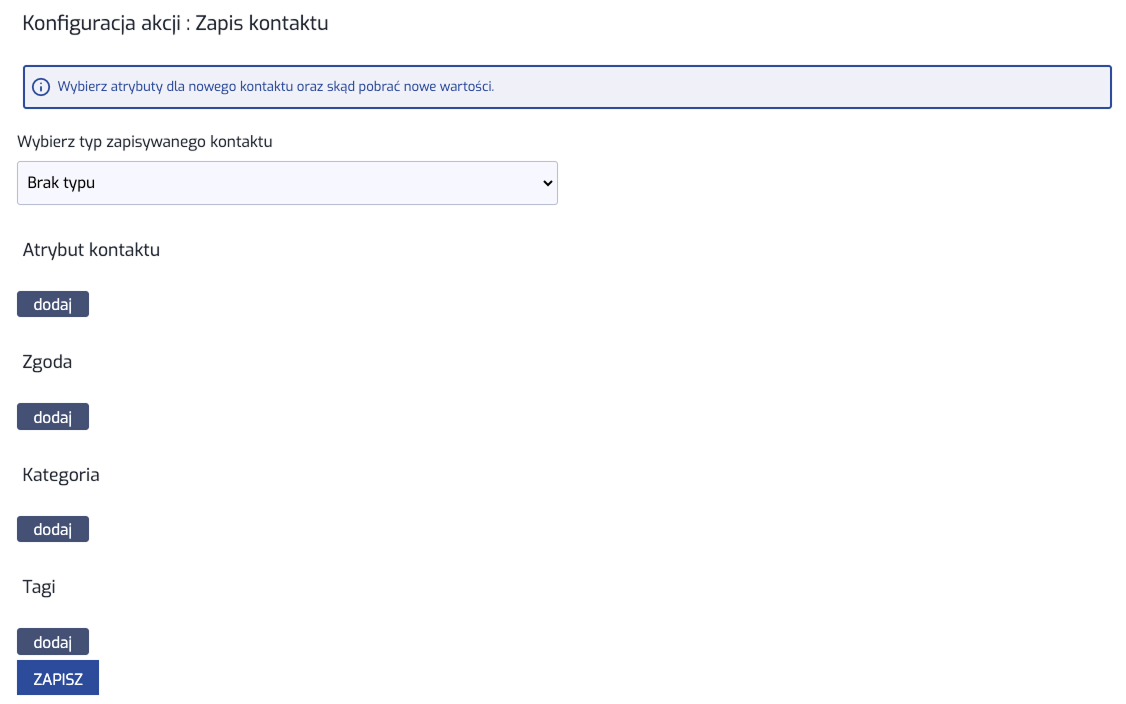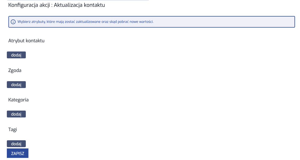 - aktualizacja kontaktu: aktualizacja atrybutów kontaktu, który został zidentyfikowany (np. imienia, nazwiska, e-maila lub dowolnych atrybutów)