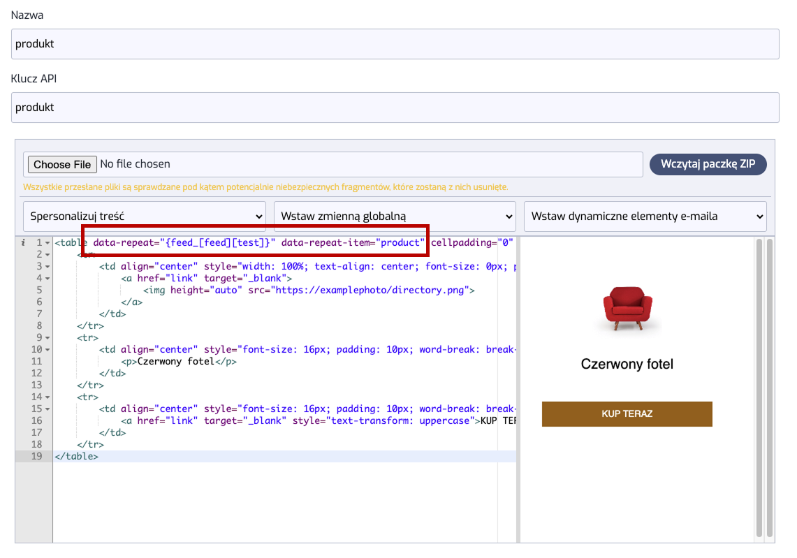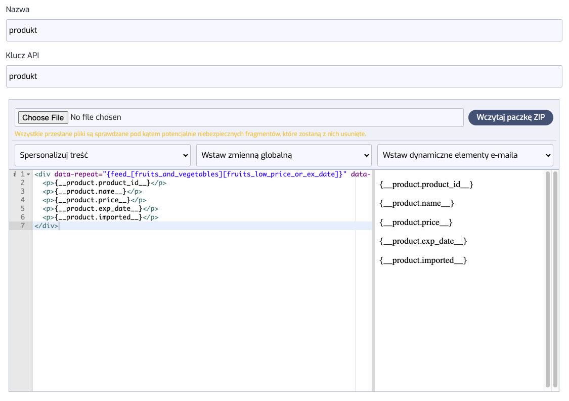 W pierwszej kolejności należy dodać nazwę oraz klucz API, który będzie służył do odwołania do bloku w kreacji mailowej, nazwa jest nomenklaturą wewnętrzną i nie jest widoczna dla odbiorcy.