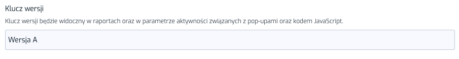 Klucz wersji Klucz wersji będzie widoczny w raportach oraz w parametrze aktywności związanych z Pop-up'ami oraz kodem JavaScript. Jest to inaczej nazwa wersji, warto ją nazwać tak, aby wiedzieć co kryje się pod tą nazwą.