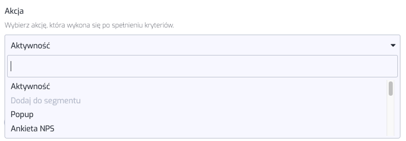 Akcja - tutaj wybieramy akcję, która wykona się po spełnieniu kryteriów. Akcja powinna być skonfigurowana wcześniej - tak jak przy akcjach bez testu A/B/X, czyli np. chcąc użyć 3 wersje Pop-upu należy wcześniej zdefiniować kreacje Pop-upów. Do wyboru mamy: