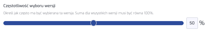 Częstotliwość wyboru wersji - Określ jak często ma być wybierana ta wersja. Suma dla wszystkich wersji musi być równa 100%. Suwakiem ustawiamy wartość dla jakiego % kontaktów spełniających kryteria system ma wylosować daną wersję On-site’u. Przykładowo dla testów 2 różnych On-site’ów można ustawić wartości odpowiednio: 20% i 80% gdzie suma = 100%. Po uruchomieniu - pierwsza osoba otrzyma pierwszą wersję natomiast kolejne 4 osoby drugą wersję.