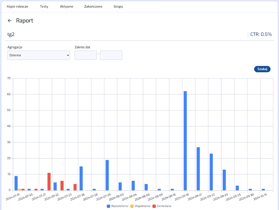 Raporty z testów A/B/X można zweryfikować dla akcji aktywnych, jak i akcji zakończonych po kliknięciu w przycisk [raport] znajdujący się przy przygotowanych testach A/B/X na liście On-site'ów. W raporcie można wybrać zdefiniowany wcześniej [klucz wersji testu] celem sprawdzenia statystyk np. dla wybranego Pop-upu oraz sposób agregacji (dzienny, miesięczny, godzinowy) lub też w zadanym okresie czasu.